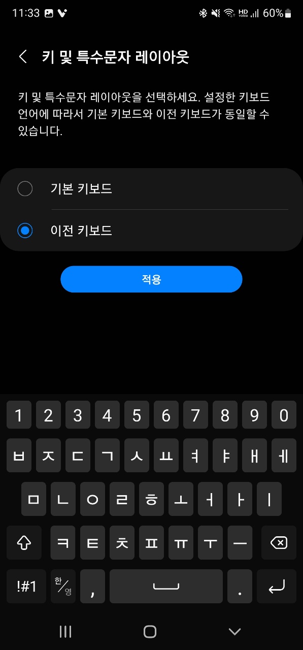 기본 키보드 옵션을 이전 키보드로 변경합니다. 그러면 이전과 같게 ~ 표시가 특수문자에 바로 보이게 됩니다.