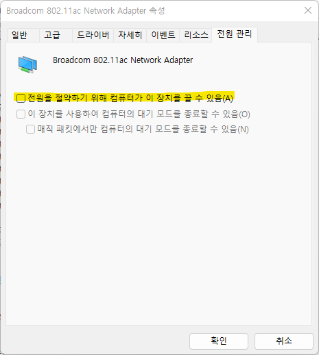 마우스 오른쪽을 클릭하여 속성팝업을 열고 전원관리 탭을 보면 전원을 절약하기 위해 컴퓨터가 이 장치를 끌 수 있음 체크박스가 있습니다. 체크를 해지하고 확인버튼을 클릭합니다.