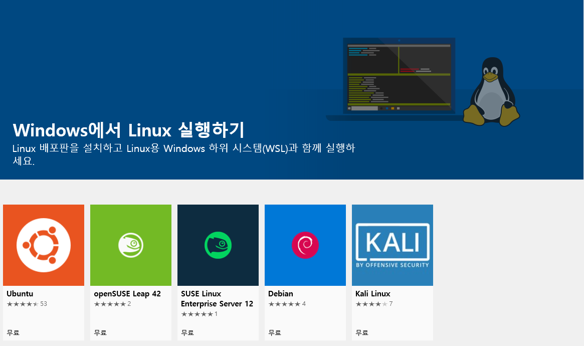 WSL 기능을 켰으면, Microsoft Store에서 관련된 Linux배포판을 설치하면 됩니다.