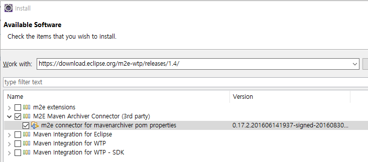 Work with에 https://download.eclipse.org/m2e-wtp/releases/1.4/ 를 입력하여, M2E Maven Archiver Connector(m2e connector for mavenarchiver pom properties 0.17.2)를 추가설치합니다.