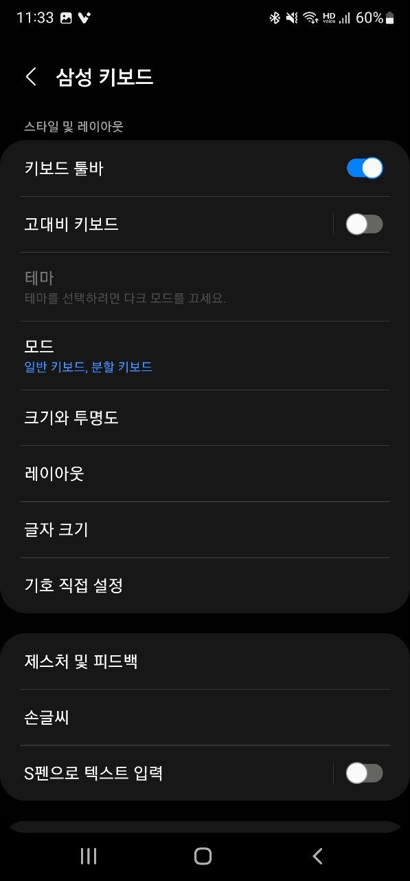 키보드 활성상태에서 톱니바퀴버튼을 클릭하거나 다음 경로로 삼성키보드 설정으로 이동합니다.