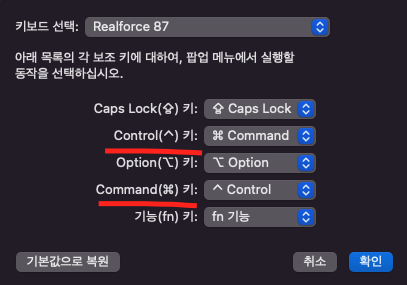 표시된 화면에서 Control과 Command를 서로 바꿔줍니다.