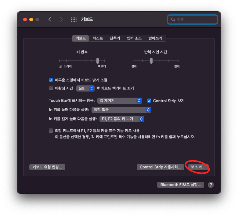 환경설정 > 키보드 > 보조 키... 를 클릭합니다.