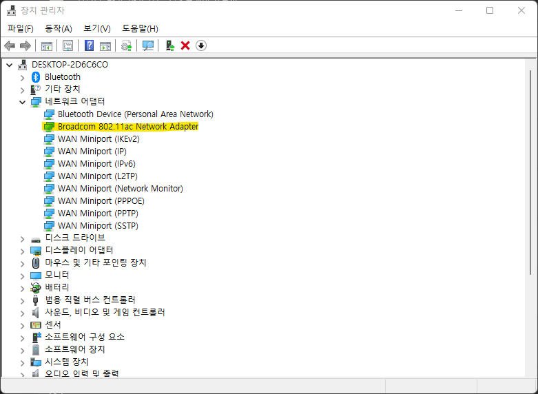 먼저 장치관리자에서 Mac의 Bluetooth 장치를 확인합니다. 네트워크 어댑터에서 Broadcom 802.11ac Network Adapter를 찾을 수 있습니다.