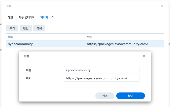 패키지 센터 > 설정 을 클릭한 뒤 패키지 소스에서 다음과 같이 입력합니다.